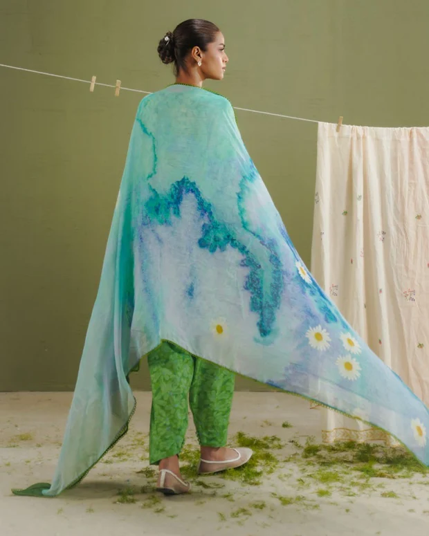 The Aqua Daisy Meadow 3-Piece Printed Lawn Suit (Coco Prints) brings a fresh and calming summer vibe. The digital printed chiffon dupatta showcases daisy florals with a soft watercolor effect in aqua marine tones. The lawn shirt and cambric trouser are adorned with daisy meadow–inspired motifs on a refreshing pear green base, creating a perfectly balanced and elegant look. Crafted from lightweight, breathable fabrics, this unstitched lawn suit is ideal for everyday wear and effortless summer styling.