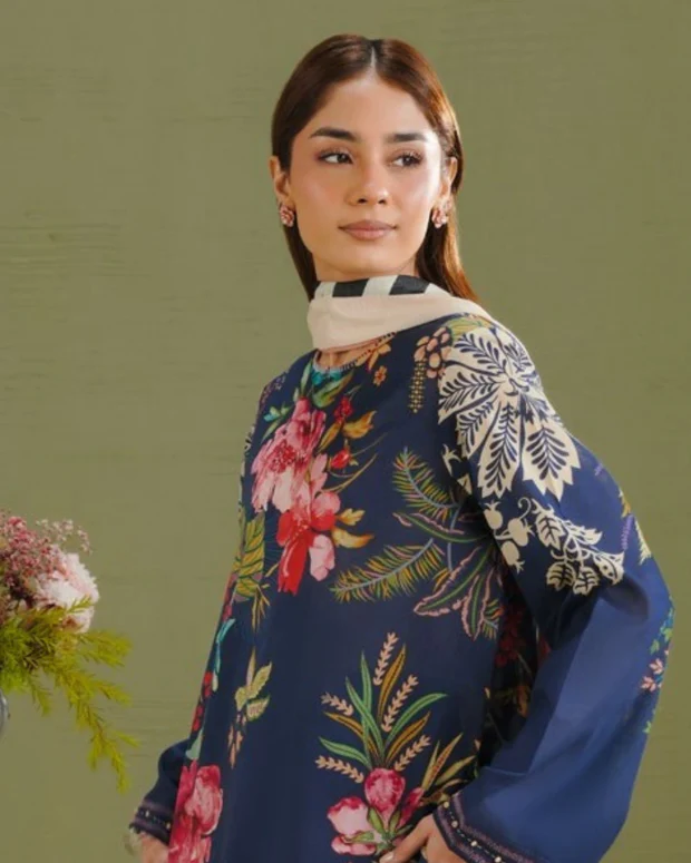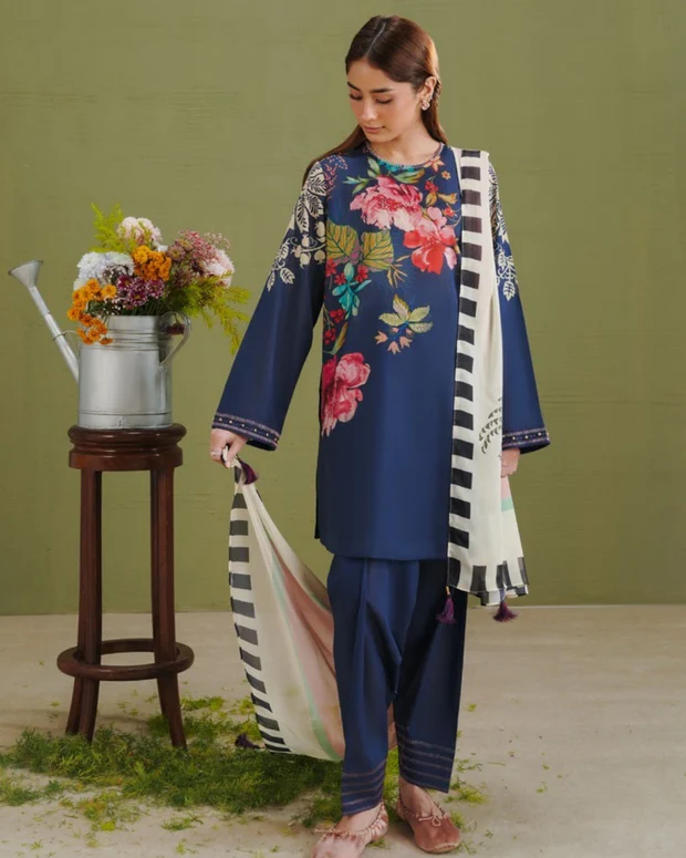 The Tea Rose & Midnight Blue Botanical 3-Piece Printed Lawn Suit (Coco Prints) brings a sophisticated blend of elegance and modern design. The digital printed silk dupatta showcases a Good Earth–inspired pattern with bold black & white stripes on a soft tea rose base. The lawn shirt features delicate floral and botanical motifs on a rich midnight blue background, complemented by cambric trousers with geometric black & white stripes. Crafted from premium breathable fabrics, this unstitched lawn suit is perfect for stylish summer wear and refined everyday styling.