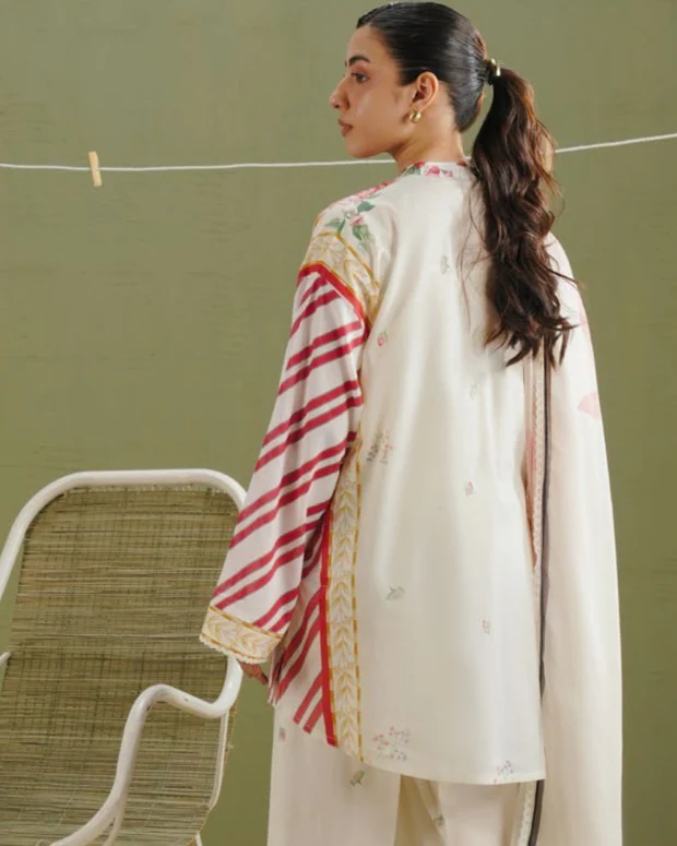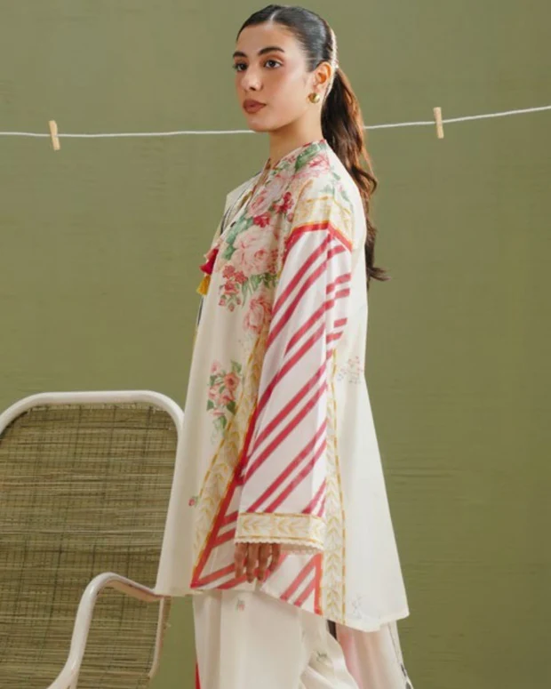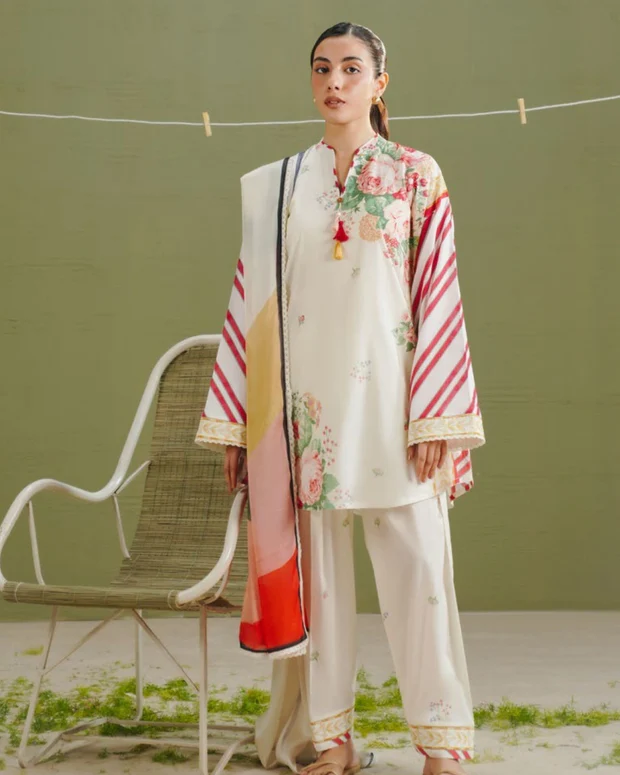 This 3-piece printed lawn suit from Coco Prints brings together modern floral aesthetics and balanced color contrast. The dupatta features an all-over floral print on an off-white base, adding softness and elegance to the look. The lawn shirt is designed with carrot red stripes layered with delicate floral motifs on off-white, creating a fresh and eye-catching appearance.