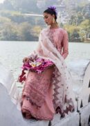 A rose pink ensemble presents a picturesque vision of modern elegance, enhanced by meticulously executed embroidery on lawn fabric. Alluring floral embroidery, featuring border detailing in summery hues, lends an ethereal quality. An ivory organza dupatta, adorned with intricate embroidery and a complementary border, completes the ensemble. This modern and dazzling silhouette is finished with coordinating rose pink embroidered trousers.