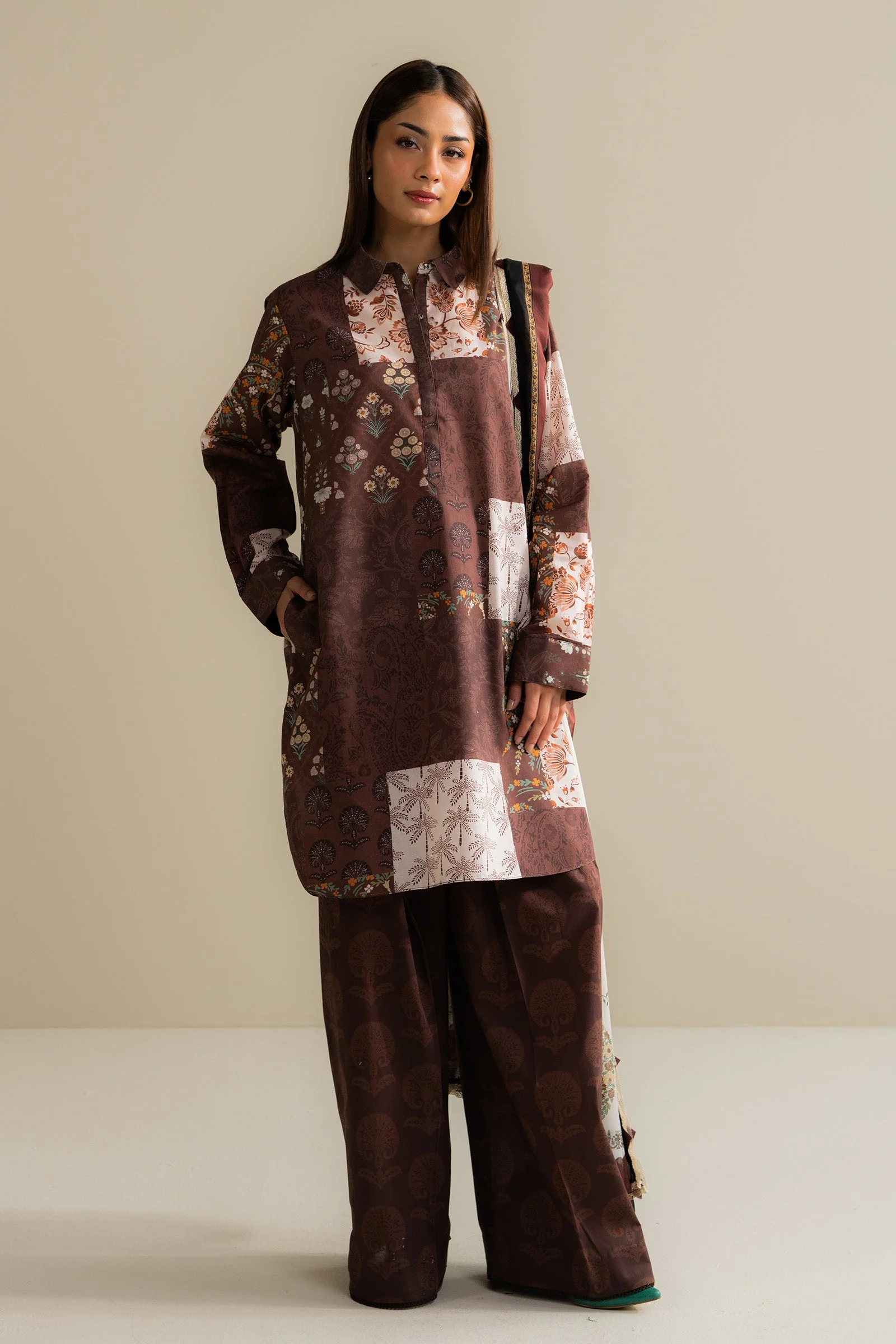 A mocha-toned shirt and trouser set, paired with a fluid silk dupatta—earthy, refined, and easy to love.